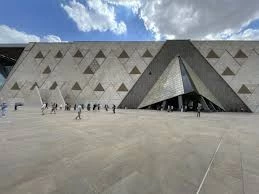 The museum's design takes inspiration from ancient Egyptian architectural elements, including the pyramids, and incorporates modern sustainable design features.