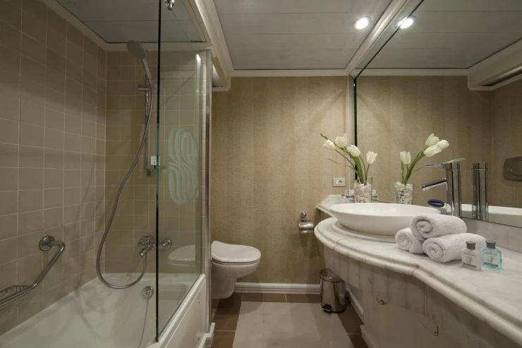 There is paid wireless internet access available throughout the ship and in each cabin. Other amenities include a direct-dial phone, individual climate control, a hair dryer, a minibar, a safety deposit box, television and movie programs, and bathtubs in the bathrooms. There is no smoking in any of the suites or cabins. Only outside is smoking permitted.