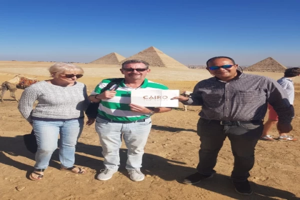 The guide will pick you up from your hotel to see the amazing Giza Pyramids. There are different pyramids to see, like the Great Pyramid of King Cheops, the second pyramid of King Khafra, and a smaller pyramid called Mankawra. You'll also get to see a special temple called The Valley Temple Of King Chephren, and a big statue called the Sphinx.